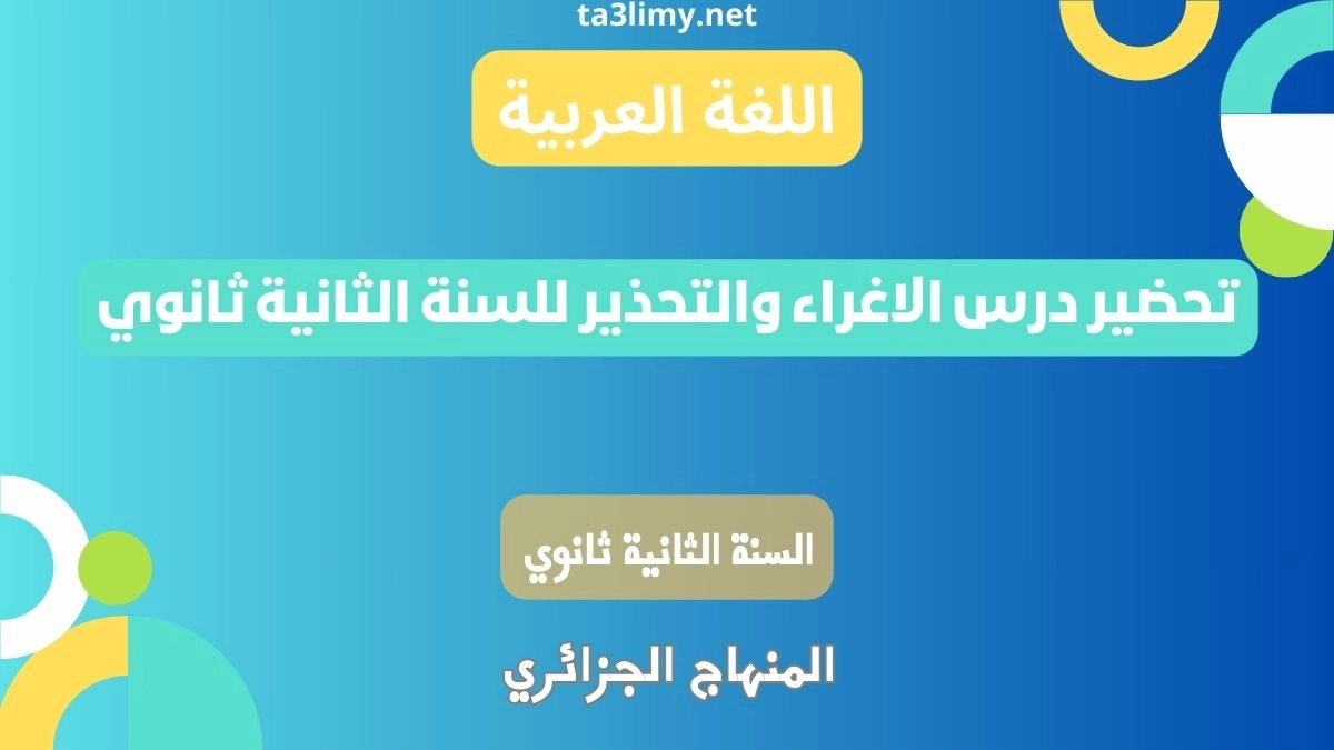 في هذا المقال، سنستعرض لكم تفاصيل تحضير درس الاغراء والتحذير للسنة الثانية ثانوي الذي يندرج ضمن المناهج الجزائرية قسم اللغة العربية للسنة الثانية ثانوي الشعب الأدبية . سنقدم لكم تحضير درس الاغراء والتحذير للسنة الثانية ثانوي الذي يواجه طلابنا صعوبة بالغة في الوصول إلى الإجابة الصحيحة.