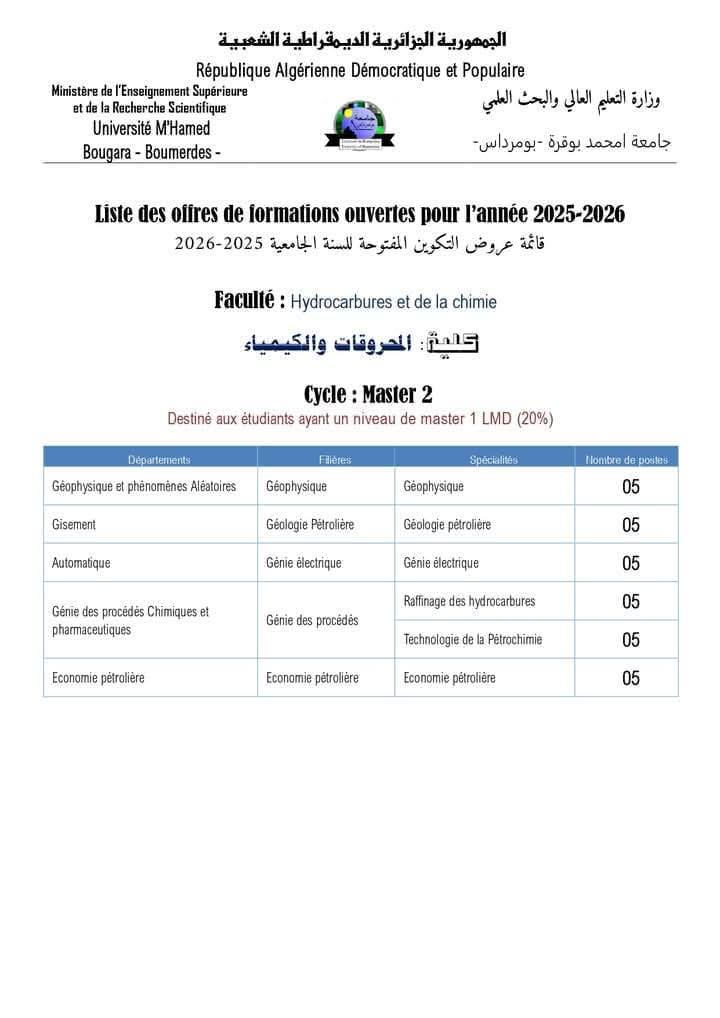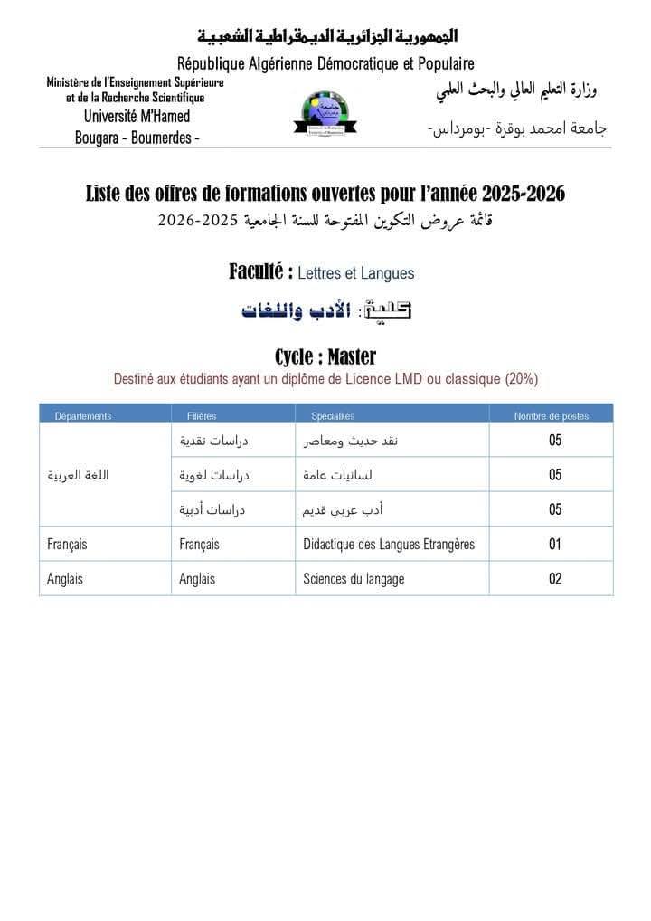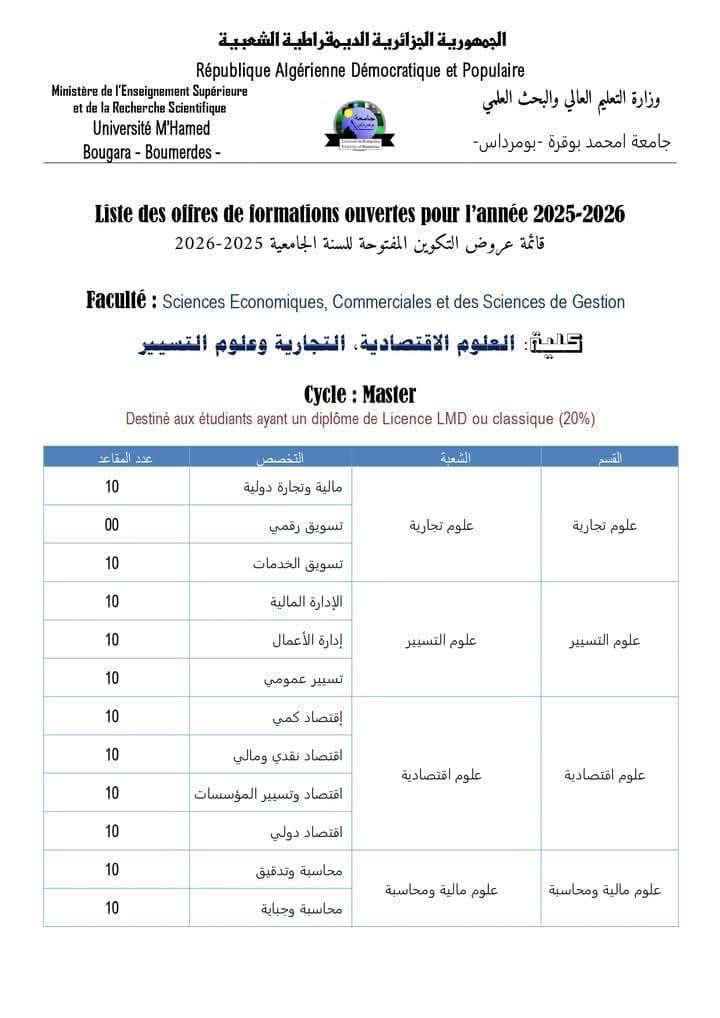 تعلن جامعة بومرداس عن فتح باب التسجيلات في :
