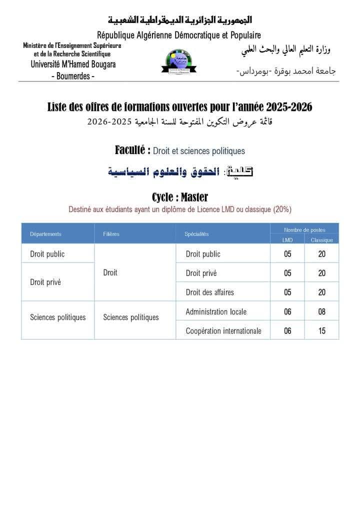 #جامعةبومرداس #الماستر #الماستر_20بالمئة #تسجيلاتالماستر #تسجيلاتالليسانس #بومرداس #الجامعة #الطلبة #التسجيلاتالجامعية #ماستر2025 #ليسانس2025 #ماسترليسانس #التعليمالعالي #الجزائر