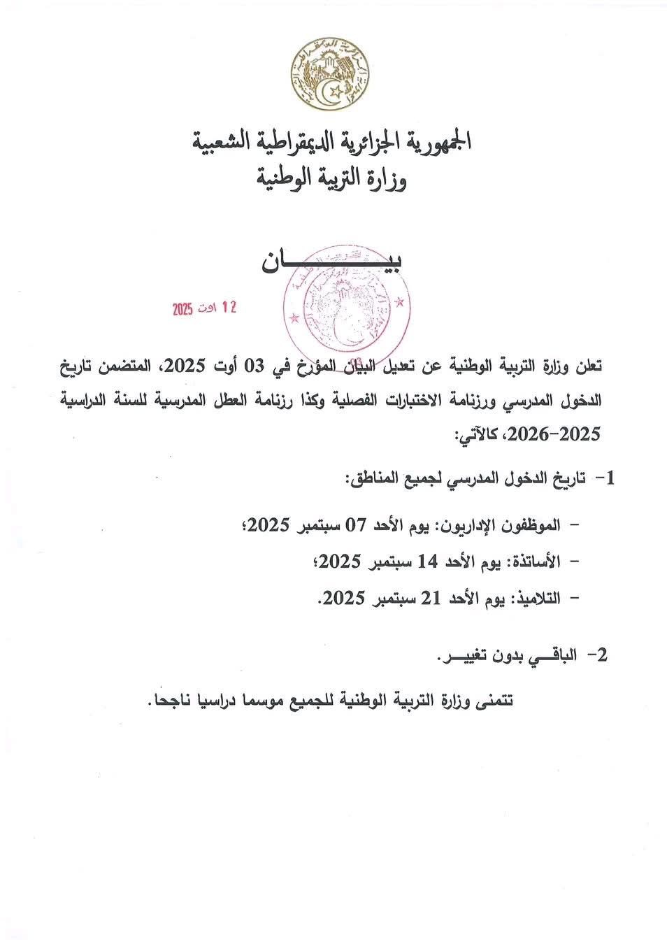 آخر اجل للتسجيل 15 أوت